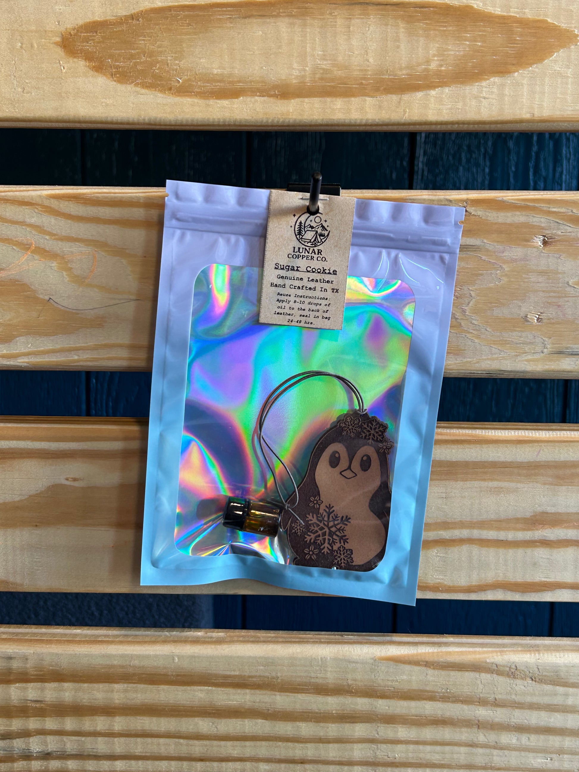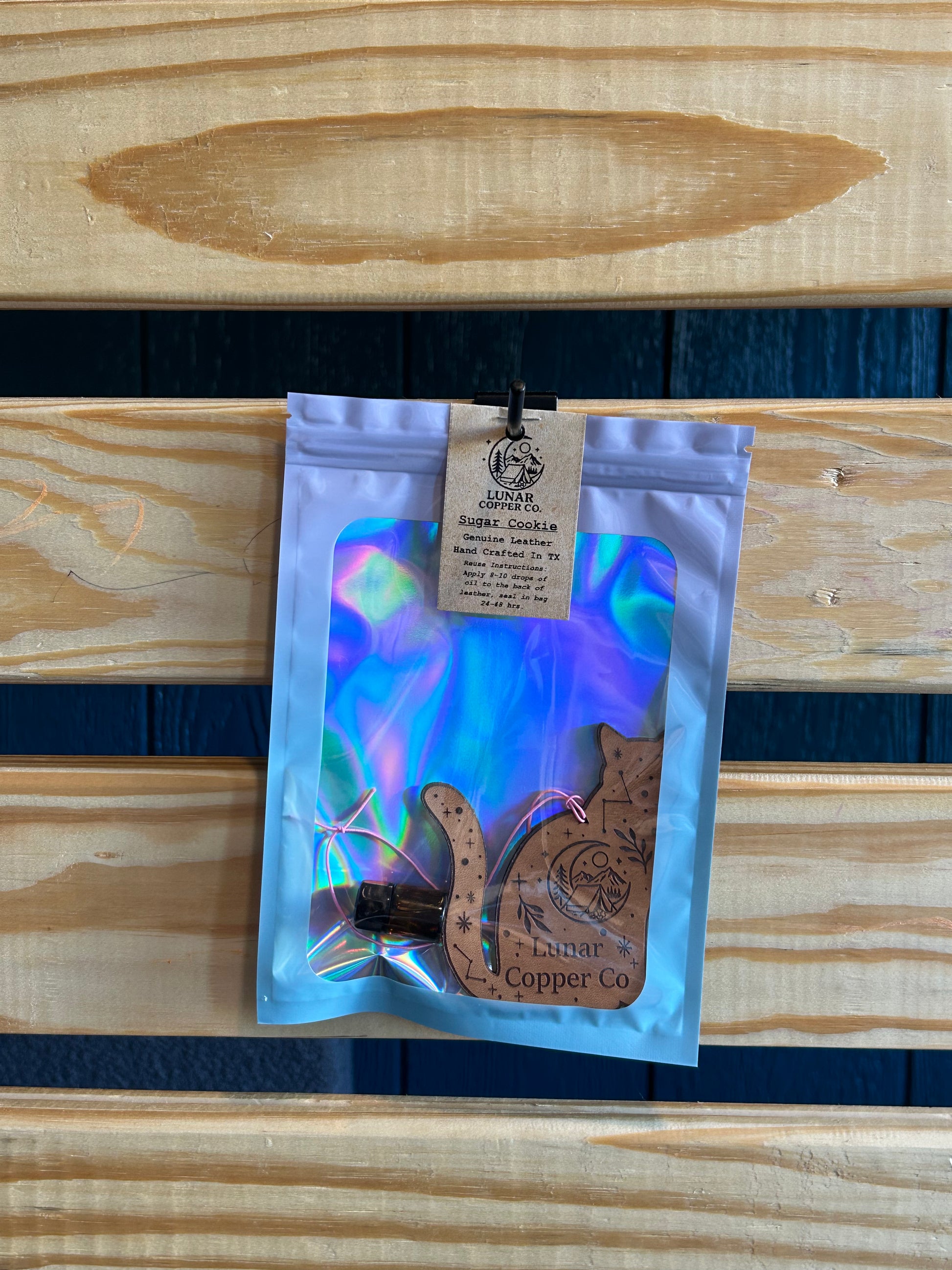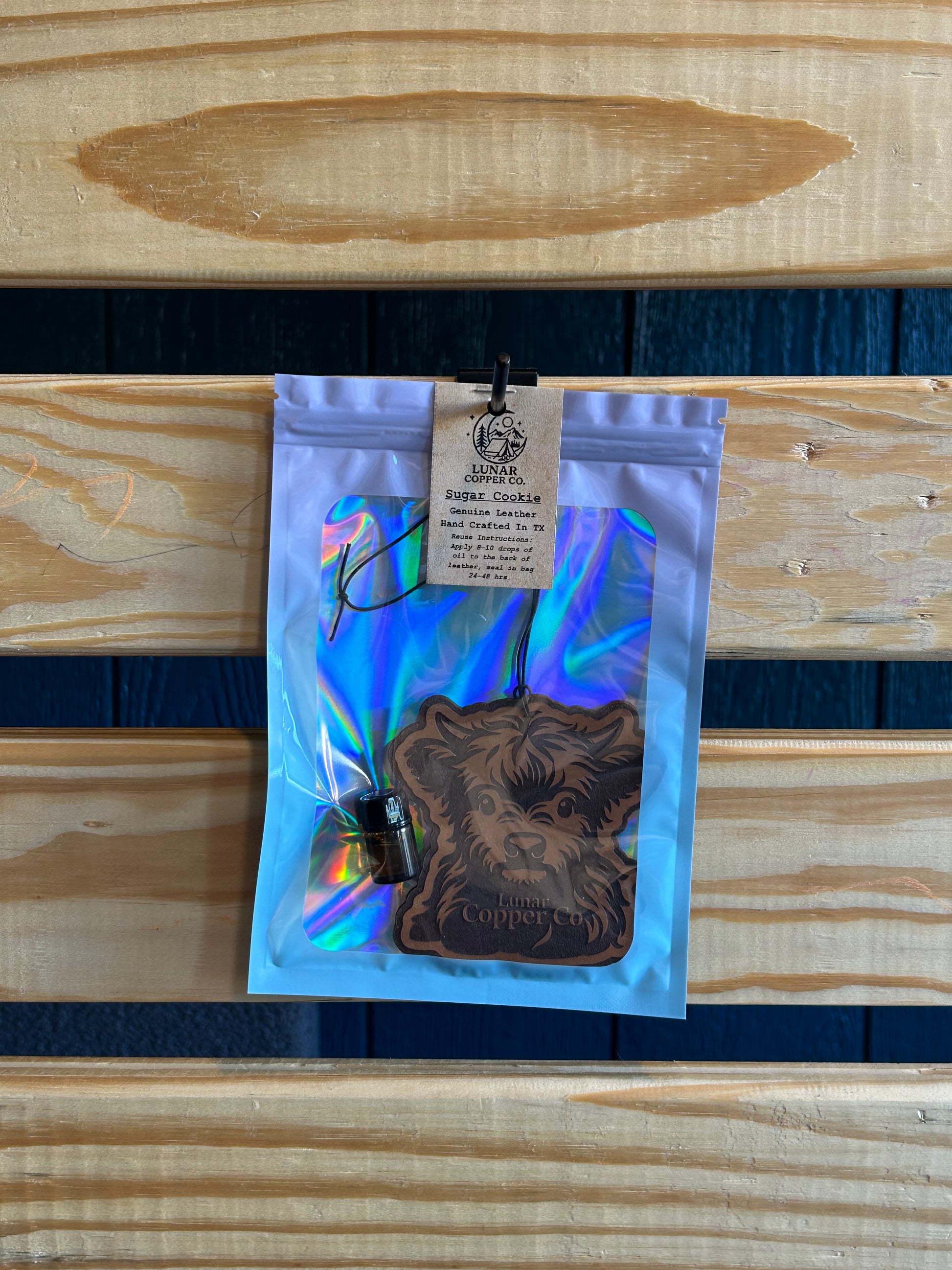 Our Sugar Cookie Freshie is lovingly handcrafted right here in Texas using quality 6oz full-grain leather that's built to last. The reusable design comes with a 2ml refill bottle, making it easy to refresh your scent whenever you need it. Depending on how strong you like your fragrance, each refill typically keeps your space smelling wonderful for 1-3 months. If you have a specific design or scent preference in mind, we'd love to help just visit our custom shop to share your vision with us.
